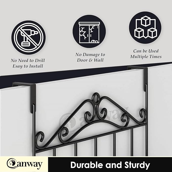 - SIZE & COLOR: The over-door hanger is 42cm (L), and 24cm (H), and comes in black. It has 7 hooks.