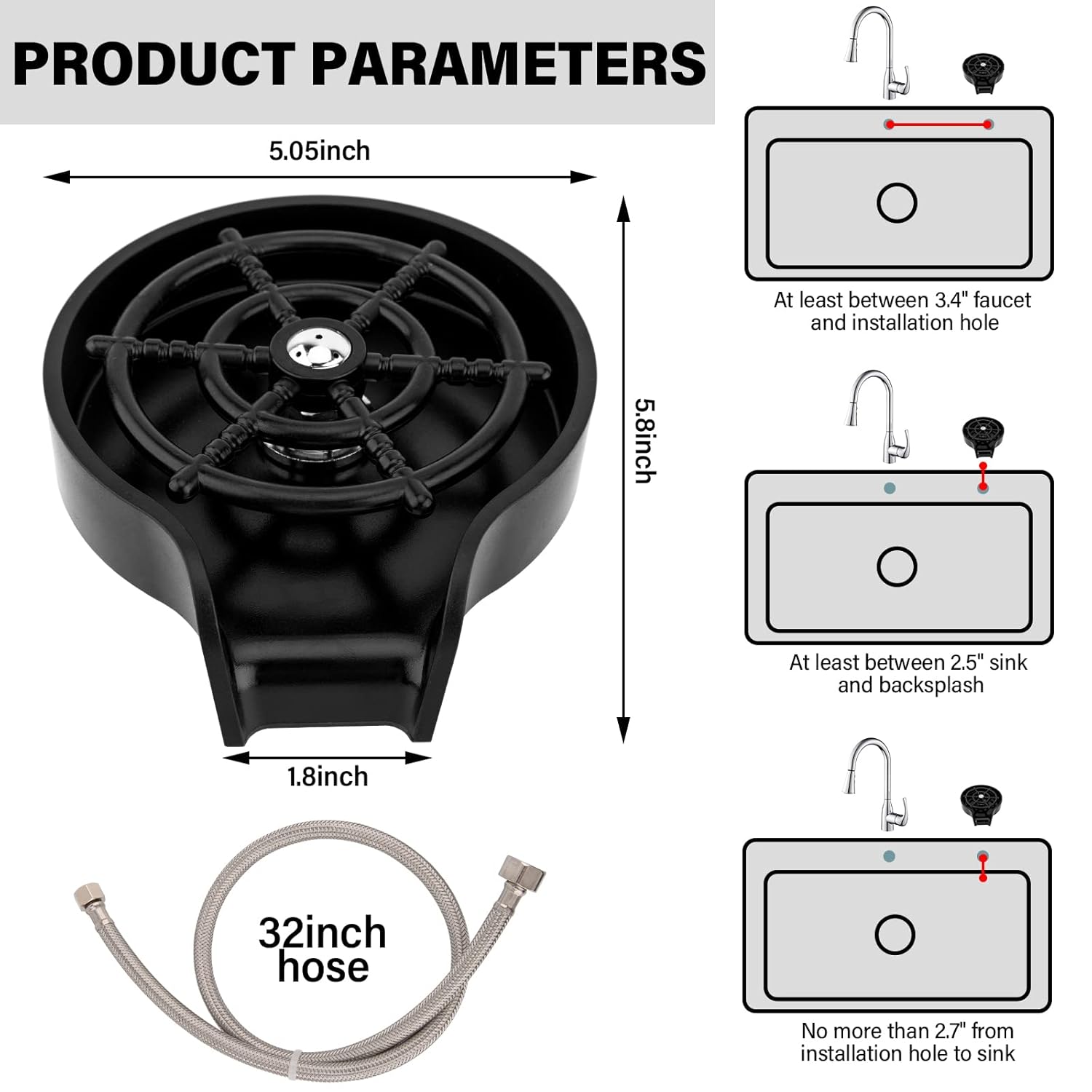 - ★【Easy installation】Must have at least 3 inches of space surrounding installation hole and no more than 2.95 inches from center of hole to the sink’s edge – ensuring water flow goes into the sink instead of pooling onto your countertop. Simple DIY replacement for a soap dispenser, kitchen sprayer or sink hole cover – the perfect complement to your kitchen Faucet. No require plumber.(include:t-connector,water hose)