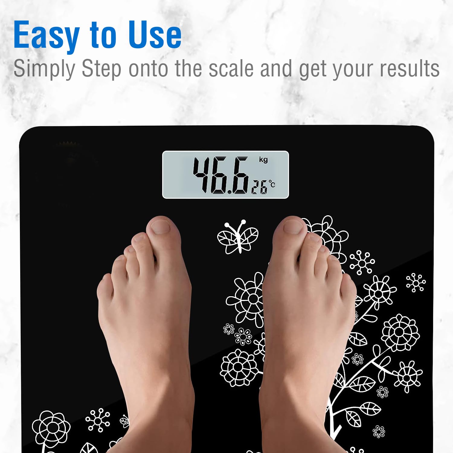 • TEMPERED GLASS & ANTI-SKID] : The thick tempered safety glass platform of the digital bathroom weighing scale is made with tough-bearing material. Its anti-scratch and anti-skid properties make it easy to clean and require low maintenance.