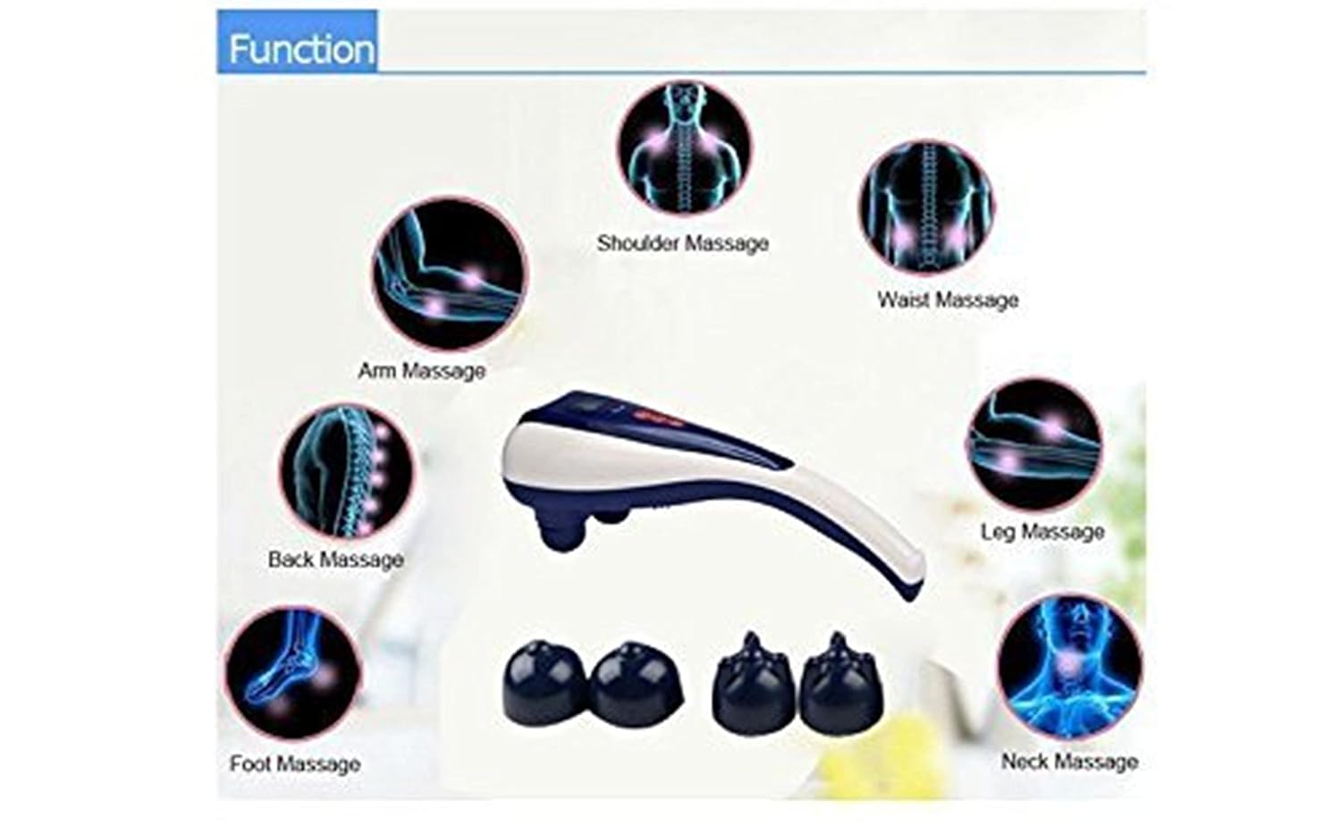 - 𝟑 𝐌𝐚𝐬𝐬𝐚𝐠𝐞 𝐀𝐭𝐭𝐚𝐜𝐡𝐦𝐞𝐧𝐭𝐬 𝐈𝐧𝐜𝐥𝐮𝐝𝐞𝐝 – Equipped with three interchangeable massage attachments to suit different body areas and massage intensities. This massage machine allows personalized physiotherapy for the full body.