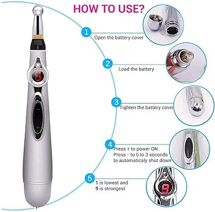 • SAVE AND EFFECTIVE : Safe and effective, with no side effects.It works on partial body parts , and spheroidal type head appliable for quickly alleviating pain , work efficiently to relieve the tension.; 9 INTENSITY MODE : You can adjust to the proper level of energy based on different treatment need , when you feel a strong pulse by tipping the acupuncture pen around your body , that means you find the acupuncture points.