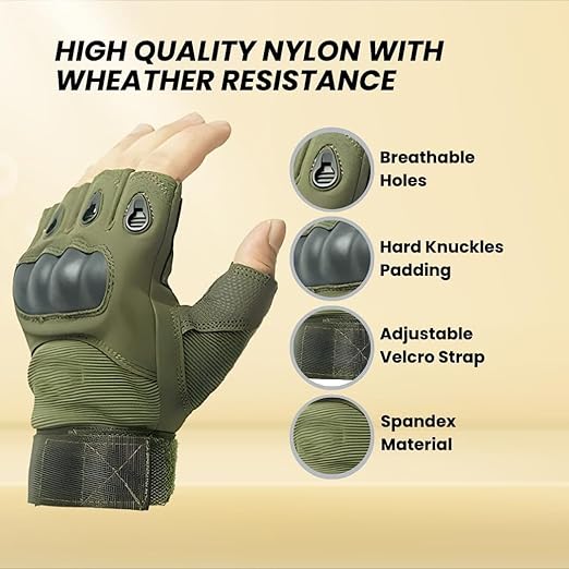 - Tactical Half-Finger Design – Engineered for freedom of movement and better control, these gloves offer protection without sacrificing finger flexibility. Ideal for clutch control, shooting, gym, or touchscreen use.