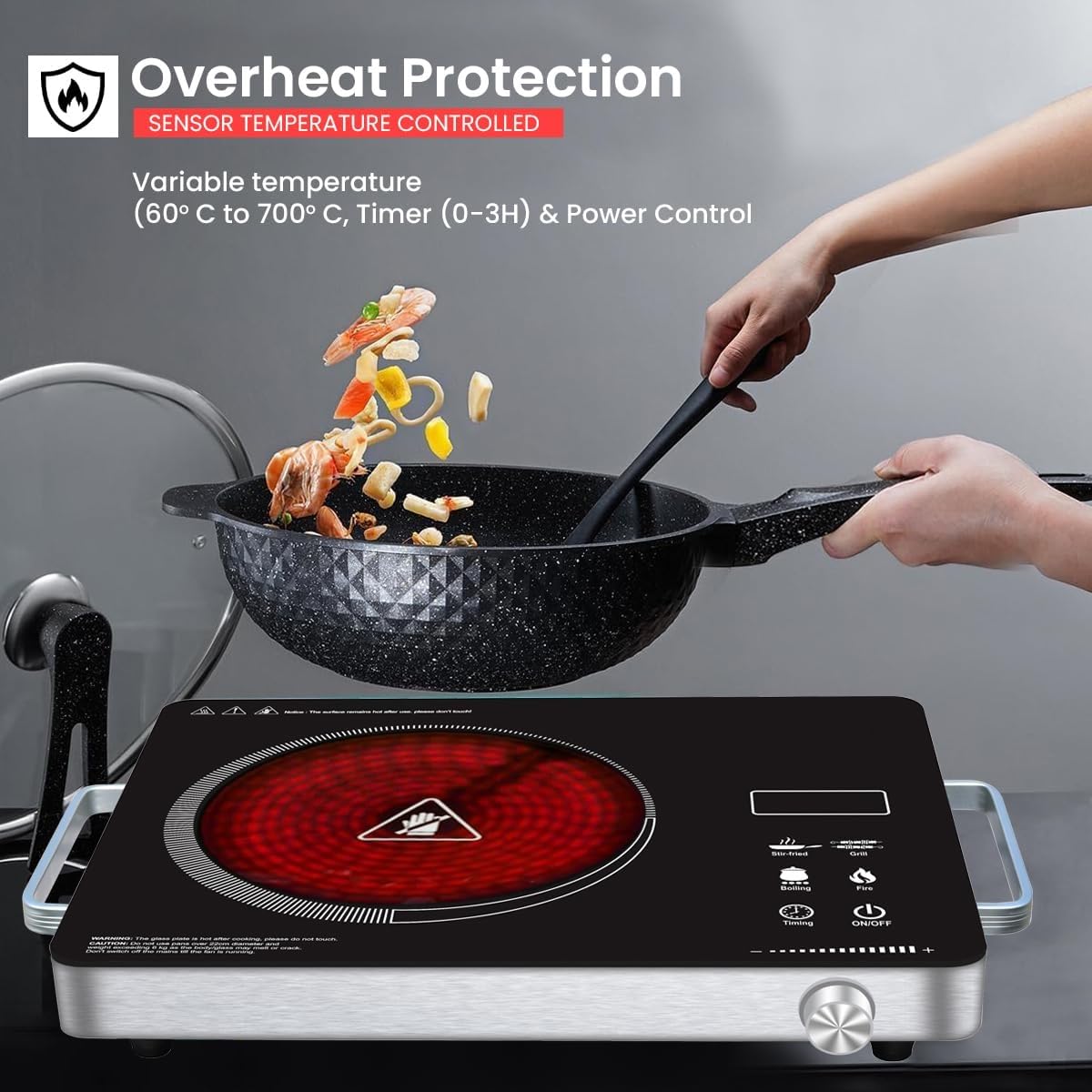 - 𝐏𝐎𝐖𝐄𝐑𝐅𝐔𝐋 𝐏𝐄𝐑𝐅𝐎𝐑𝐌𝐀𝐍𝐂𝐄: The Premium 2200W infrared induction stove delivers powerful and precise heating through 3 preset cooking modes for boiling, simmering, and warming.