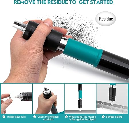 - 5.Double Silencer Steel Nail Gun:-Thicken the silencer cover to reduce noise; Just push and release, It only takes 1 s to work; No electricity required; Making the construction sence more comfortable without disturbing residents.