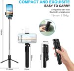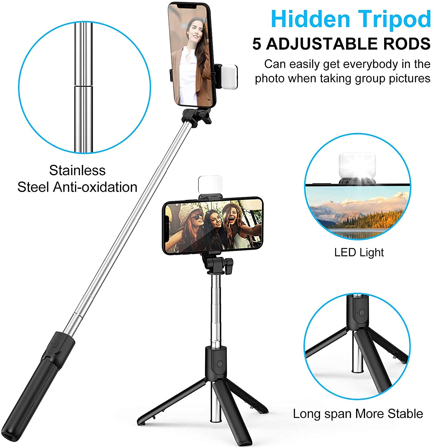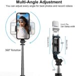 - Selfie Stick Tripod With Wireless Remote :- 2-in-1 selfie stick tripod with built-in wireless remote allows you take selfie-photography or you can separate the remote control to take group photos like parties, graduation, wedding, travel. You can use it as a regular selfie stick or as a quick and easy tripod. **Note**: Under tripod mode, the center of gravity of cellphone must be kept in line with the selfie stick. The lower the height of extendable rod, the better the stability.