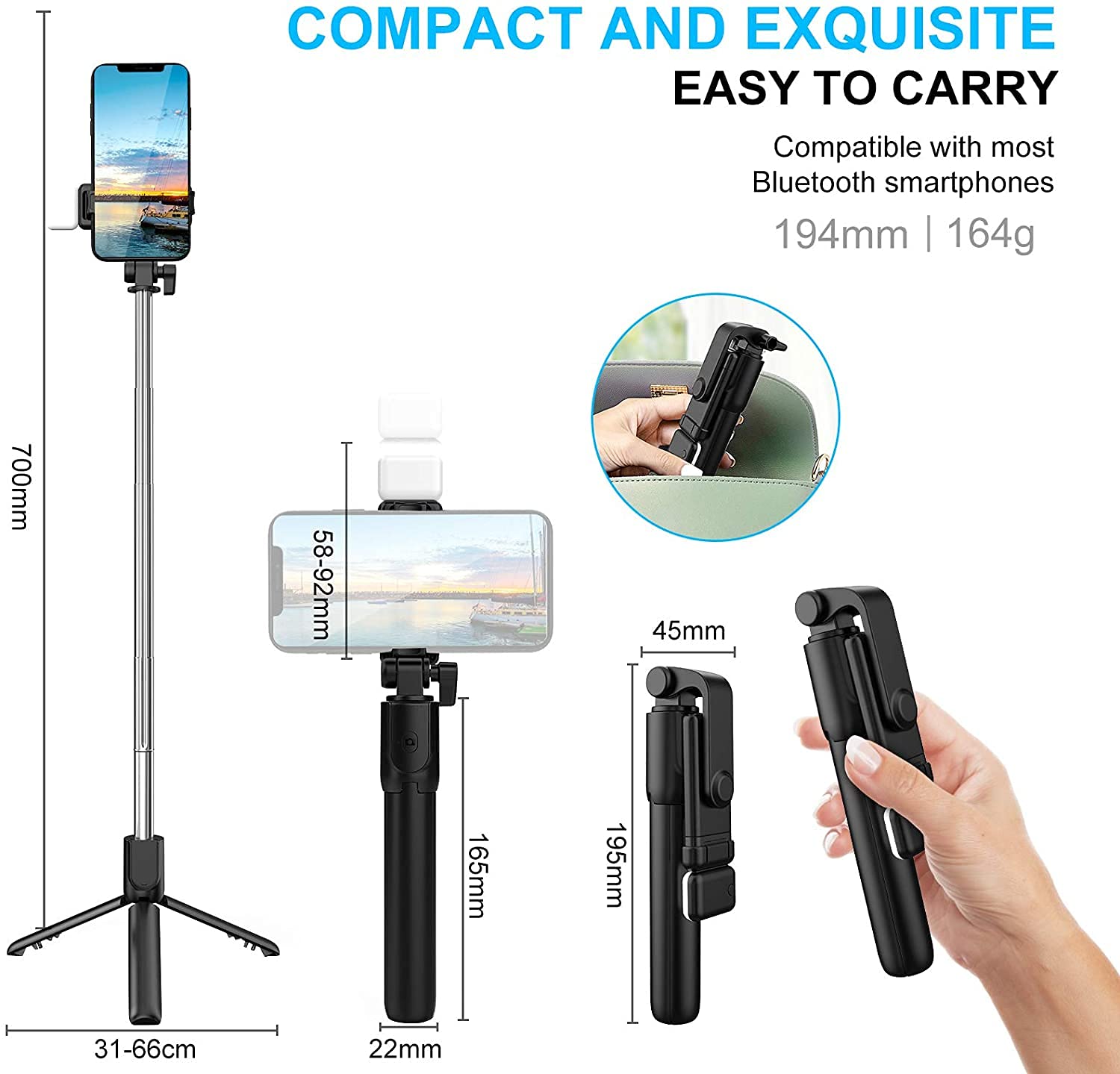 - Three-in-one Compact selfie stick with Wireless Remote Control and integrated with tripod, product length up to 68 cm, the range of the wireless connection can be up to 10 meters. New experience great for Selfies, Group Photos, Face-time, Life-logging, Video shooting, Social live