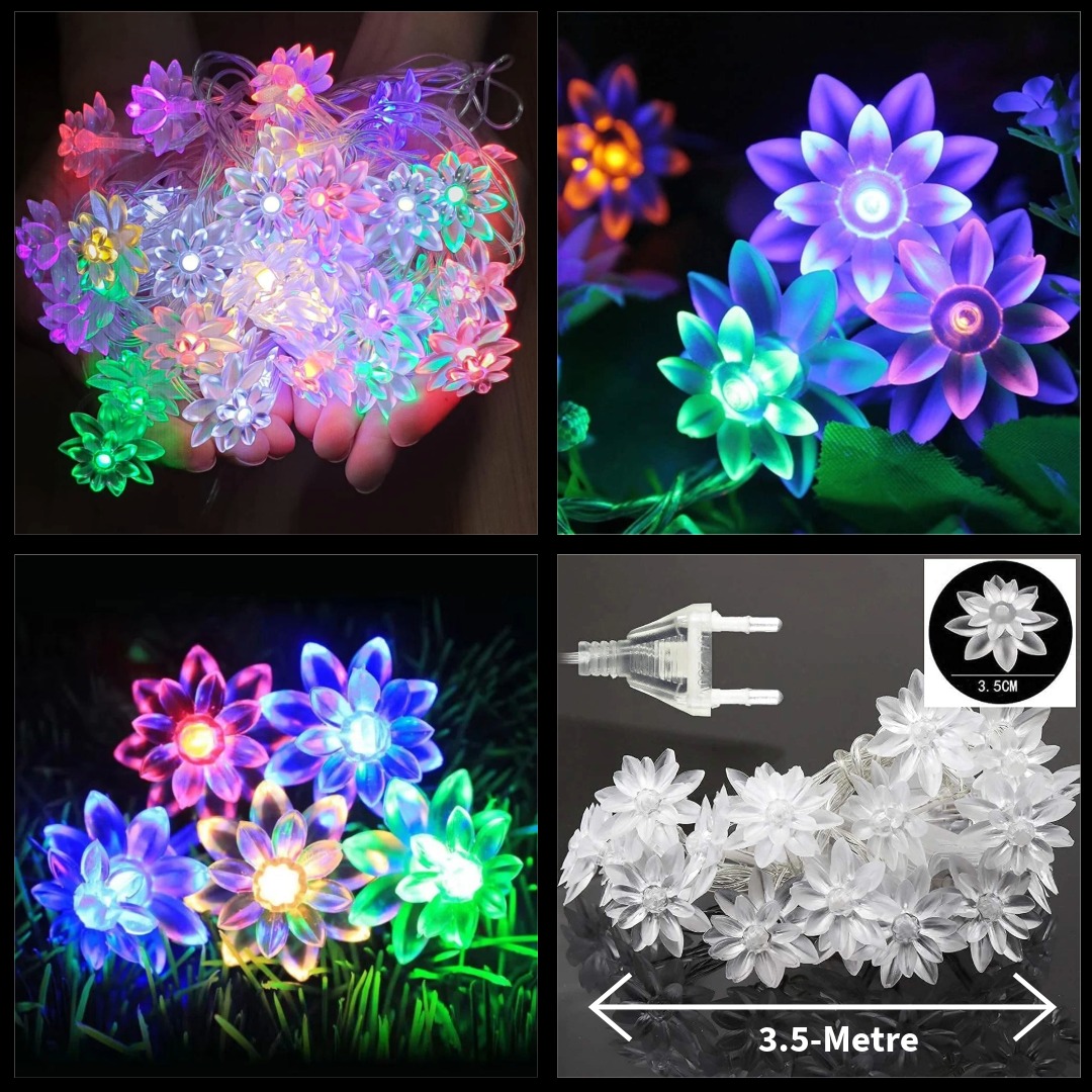 ELEGANT MULTICOLOR SILICON FLOWER LIGHT : This is 1pc of lenght 3.5 meter flower light with 14 flowers, corded light is crafted with attention to traditional aesthetics, making it perfect for Diwali light for room decoration, fairy lights for room decoration or other cultural themes. The floral design enhances any space, offering a peaceful and sophisticated feel. These lotus flower string lights can also be creatively styled as wall decorative light or used alongside light decoration items for an enriched festive ambiance.